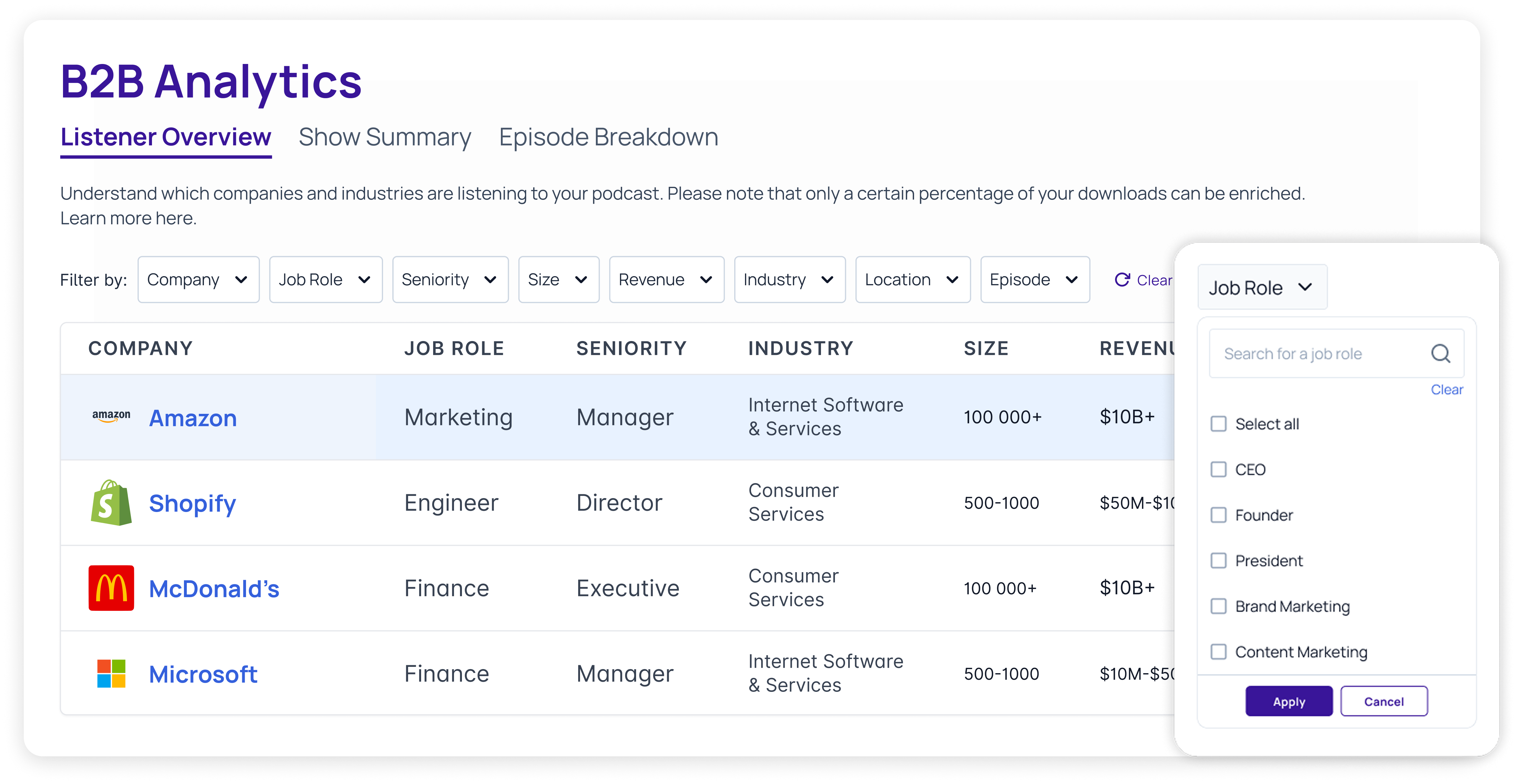 Discover which companies, industries, and job roles are engaging with your podcast. Connect podcast performance to business outcomes and pipeline.