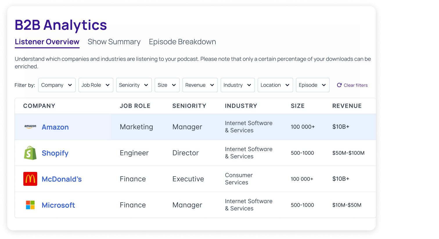 CoHost's B2B Analytics identifies the companies, industries, job roles, and seniority levels listening to your show. With our Salesforce integration, you can push that audience data directly into your CRM, so sales teams know which prospects are already engaging.