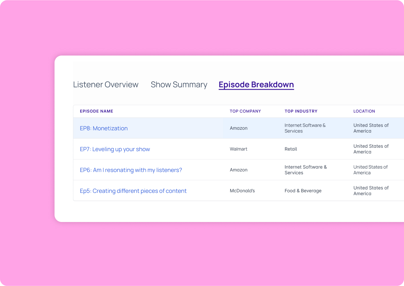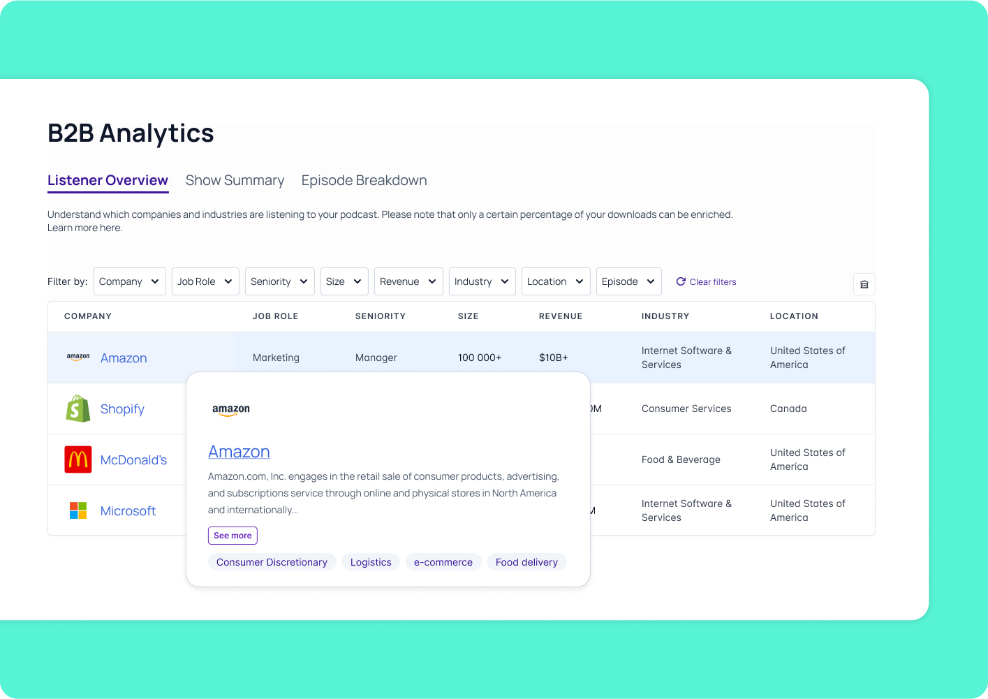 Get a detailed look at the companies listening to each episode, including company size, industry, revenue, and location