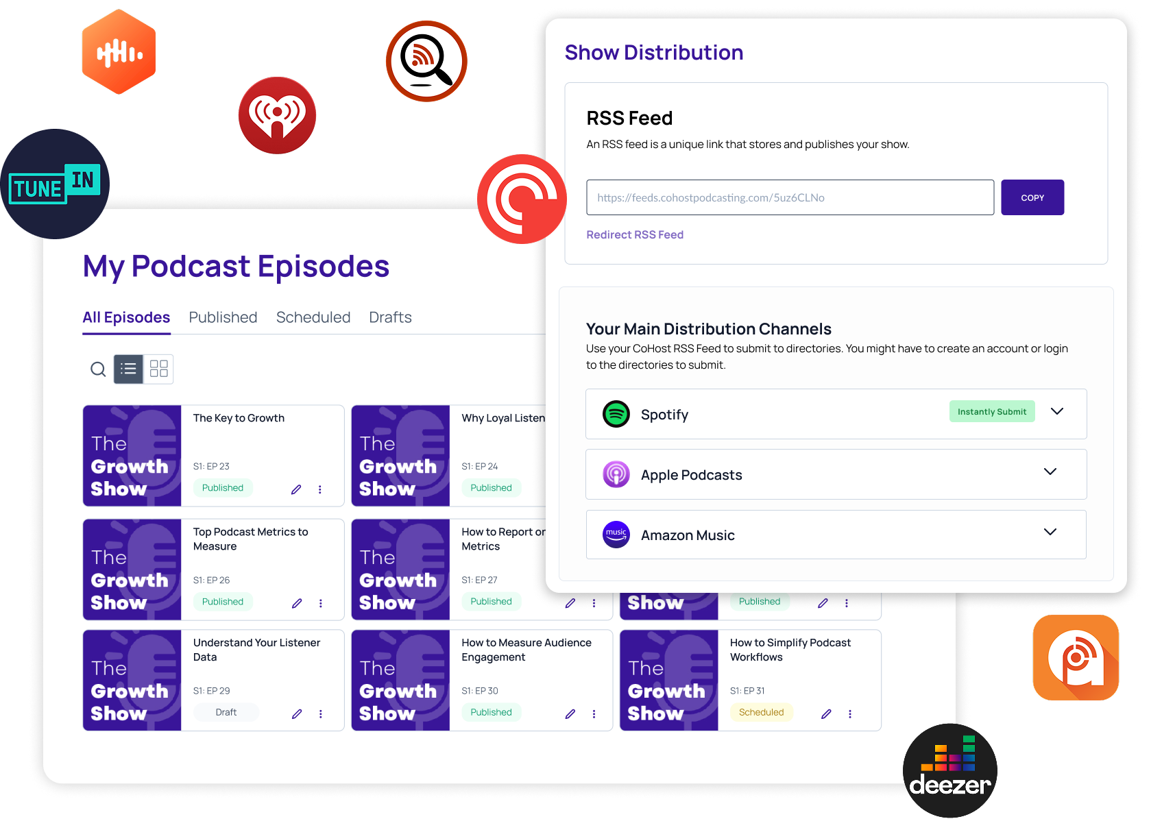 CoHost publishes your podcast on all podcasting apps that take your RSS feed. This includes Apple, Spotify, Amazon Music, Player FM, Overcast, Podcast Addict, and more. We do not distribute on Soundcloud.
