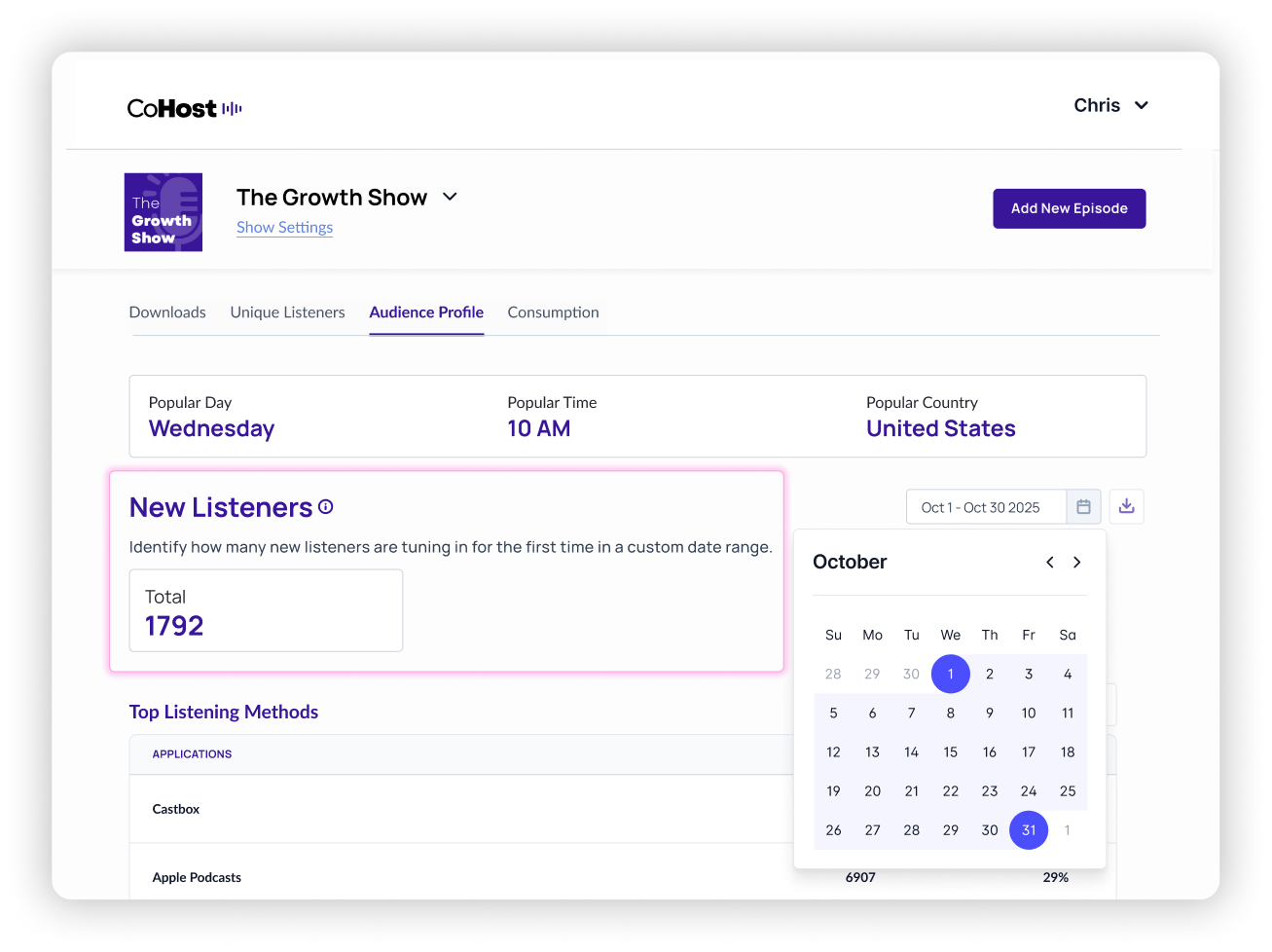 Go beyond downloads to understand how your audience is growing. Track how many listeners are tuning in for the first time to measure discovery, marketing impact, and audience growth over time.