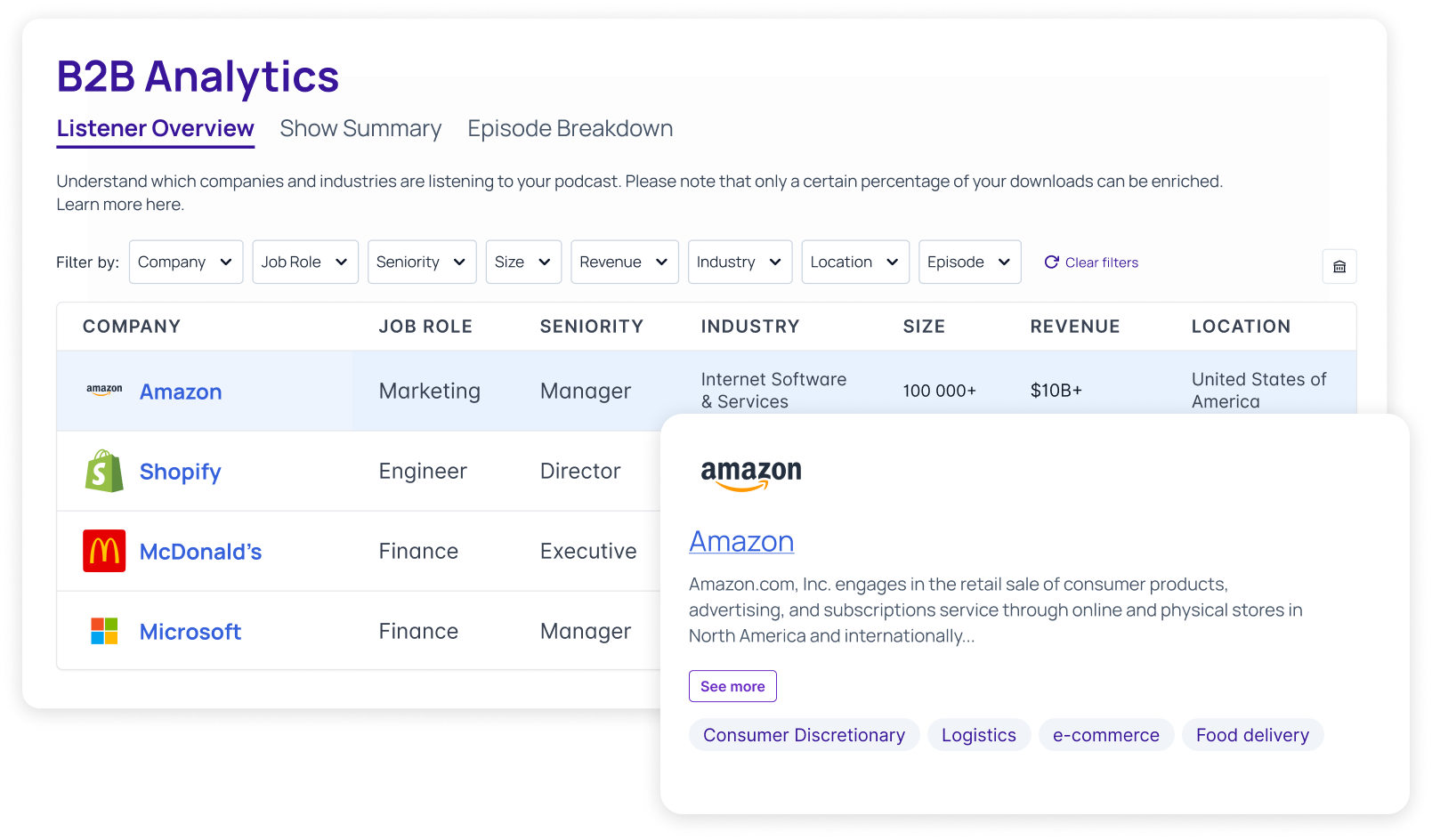 ExploreIdentify companies, industries, job roles, and seniorities tuning into your podcast. Align the podcast with business goals and report impact to stakeholders.
