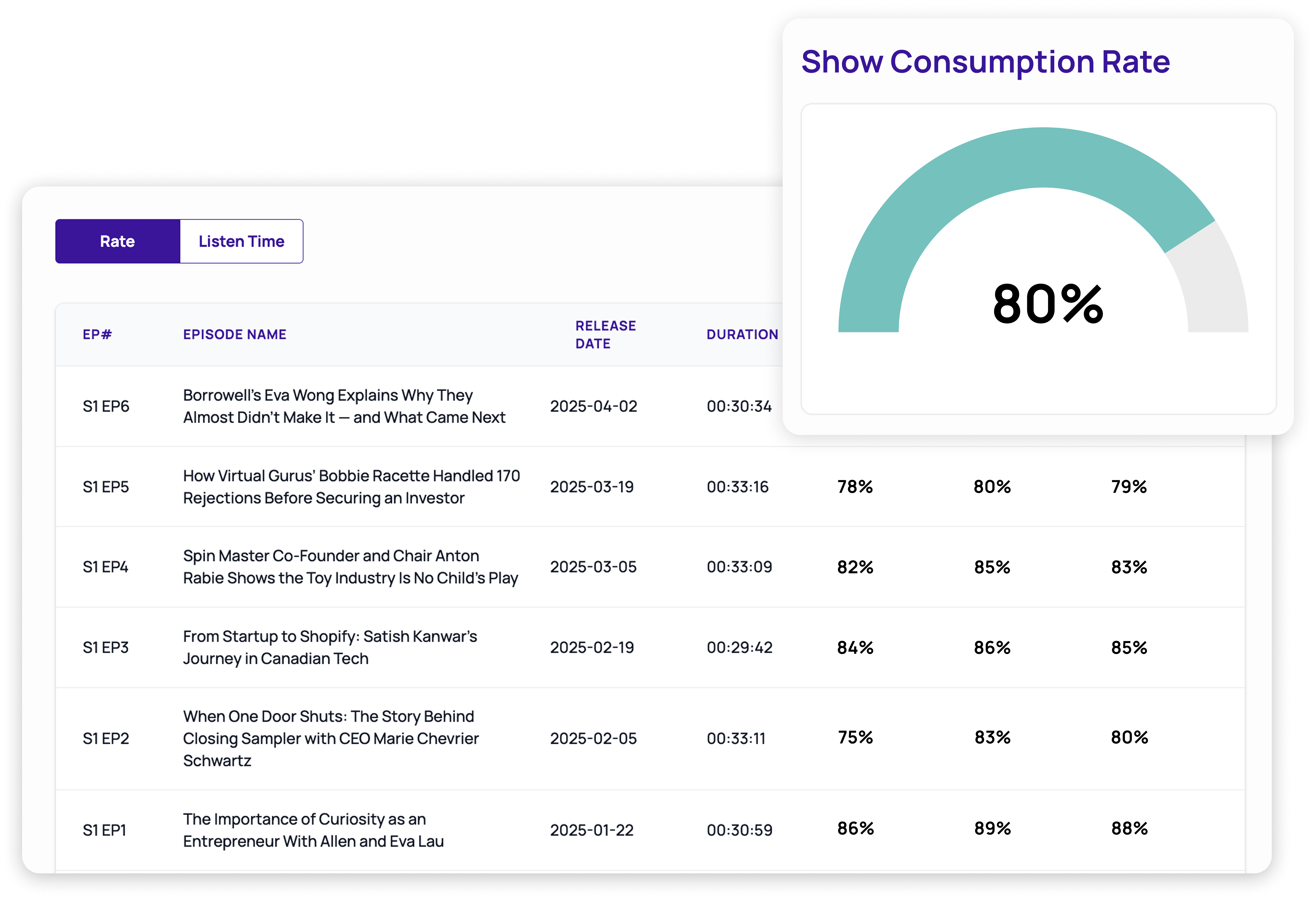 Pulling from Apple and Spotify, know how long listeners are tuning in during episodes and where they drop off. Get granular with both show-level and episode-level insights.