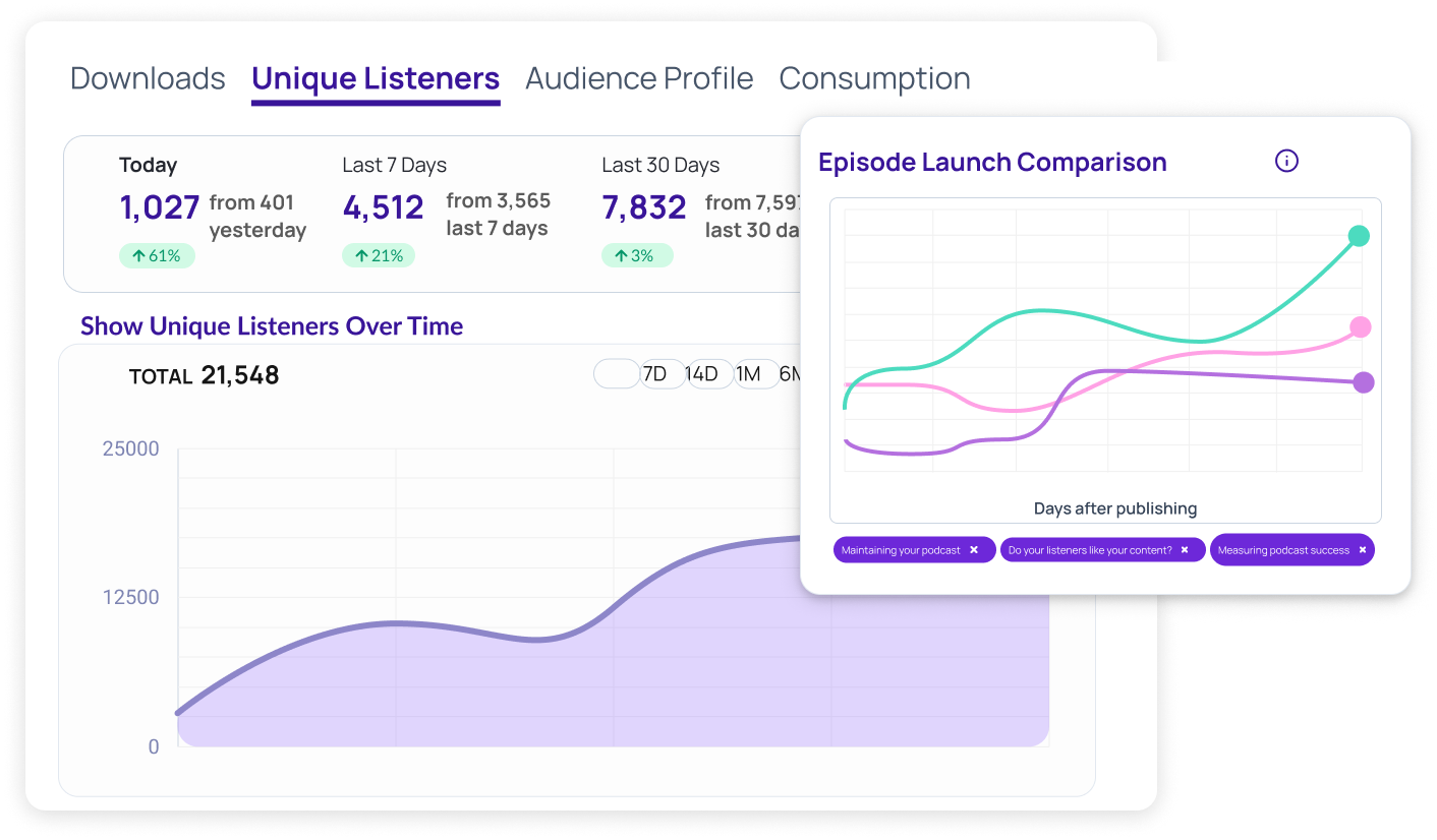 Track growth over time, compare episode performance, and identify your best (and worst) performing content at a glance across unique listener and download dashboards.