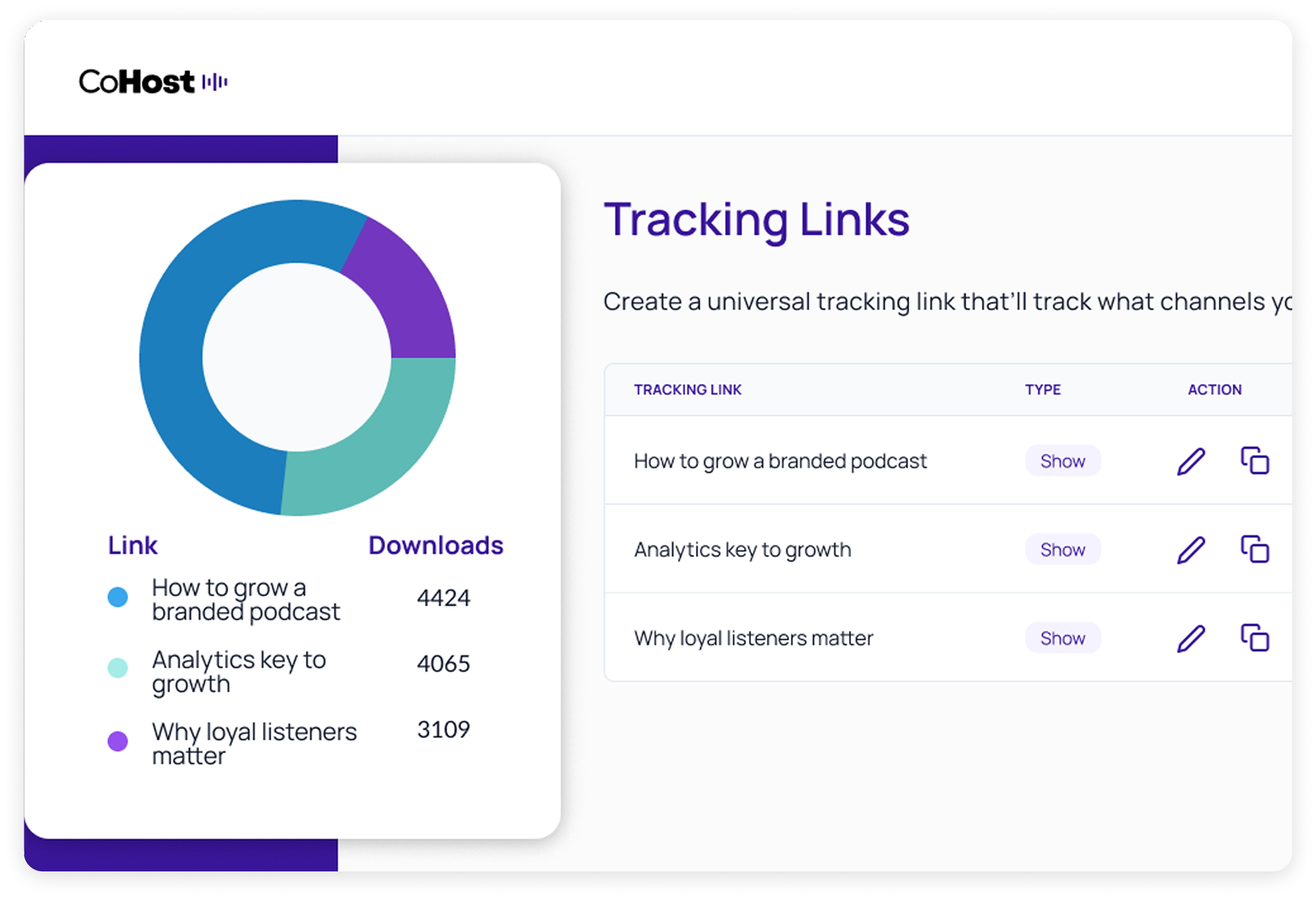 CoHost centralizes your analytics—downloads, demographics, consumption rates, tracking links—all in one unified dashboard. No more patchwork reporting.