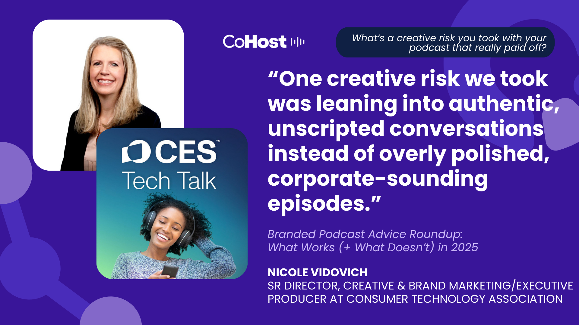 “One creative risk we took was leaning into authentic, unscripted conversations instead of overly polished, corporate-sounding episodes. At first, that felt risky...would audiences expect something more buttoned-up from CES? But it paid off in a big way. Listeners responded to the real, human side of tech stories and the accessibility of thought leadership when it feels like a conversation, not a presentation.