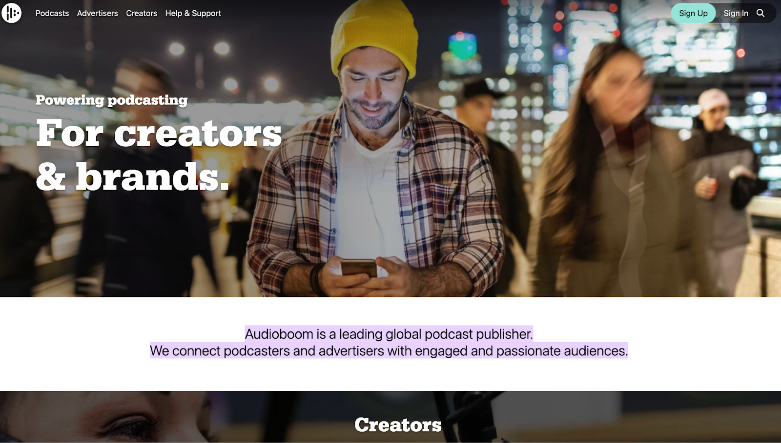 For advertisers, AudioBoom's Premium Network features live reads and host endorsements from their top 250 creators, allowing brands to select the best shows and hosts to align with their message.