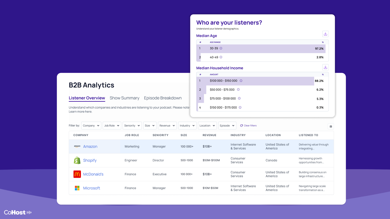 How audience data helps: You can use CoHost’s firmographic data to see how many listeners come from those target accounts, or which companies listening match the same size, industry, or buyer titles.