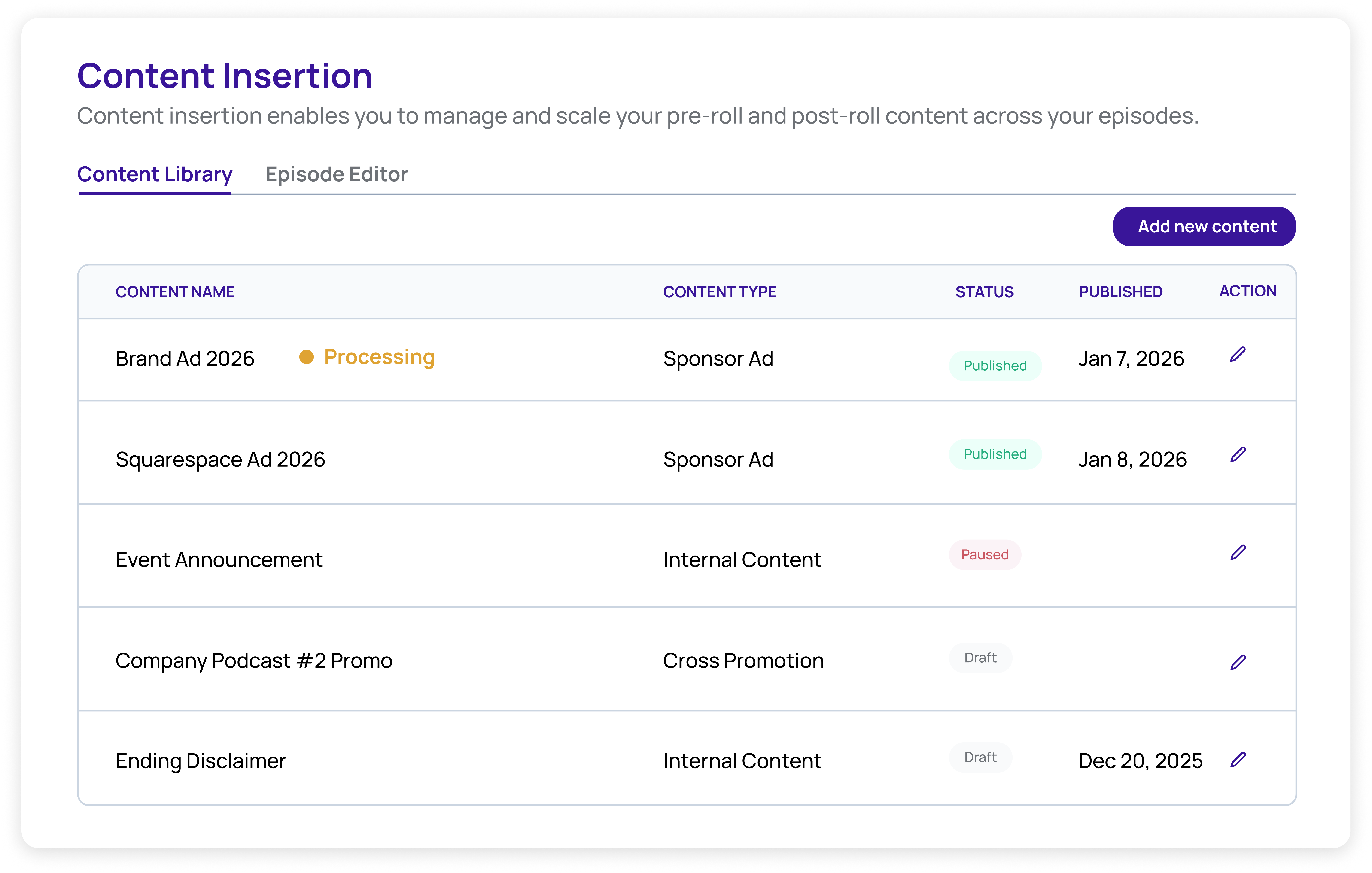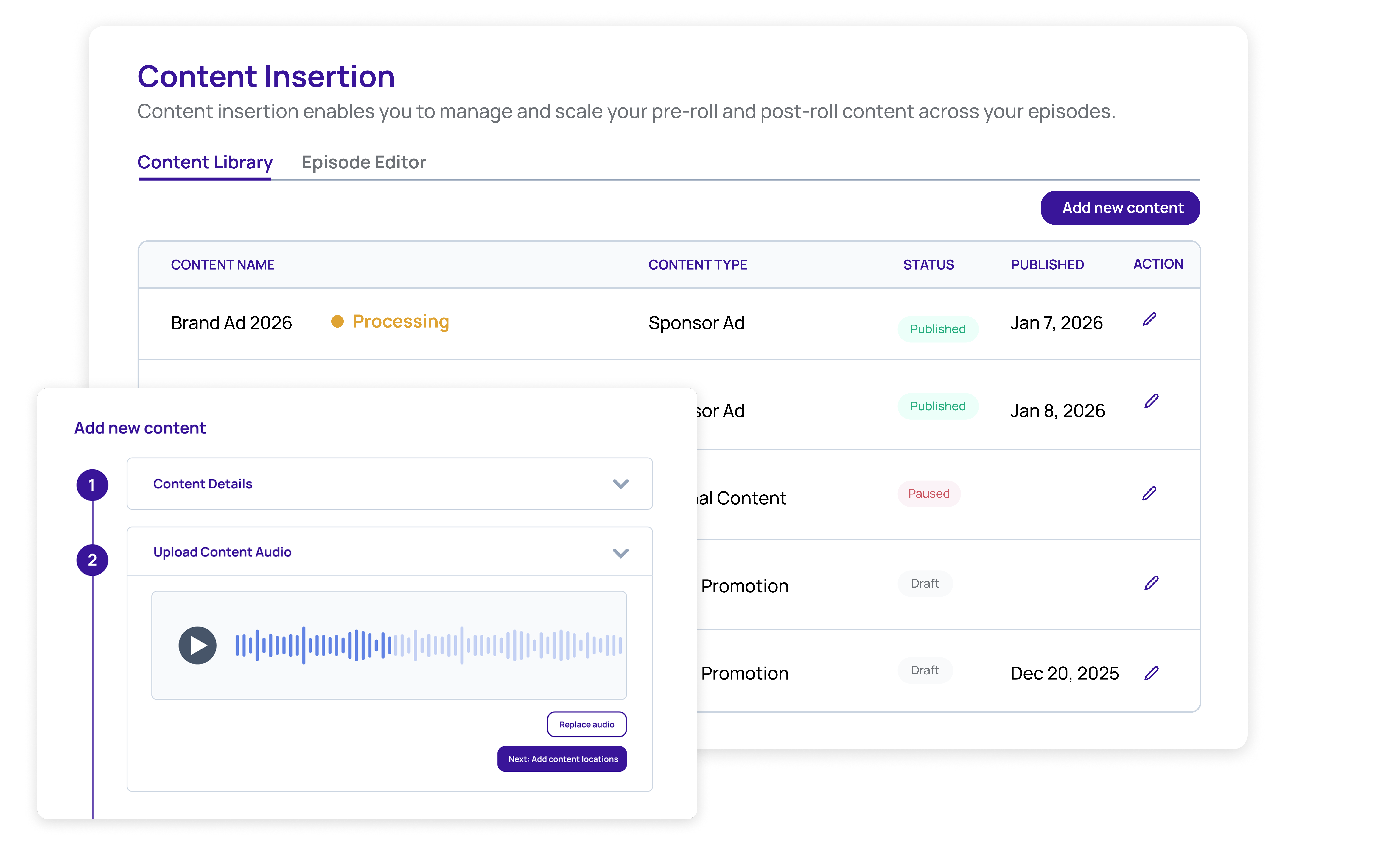Run announcements, event promos, sponsor reads, and product updates across your episode catalog in minutes (no re-exports or re-uploads).