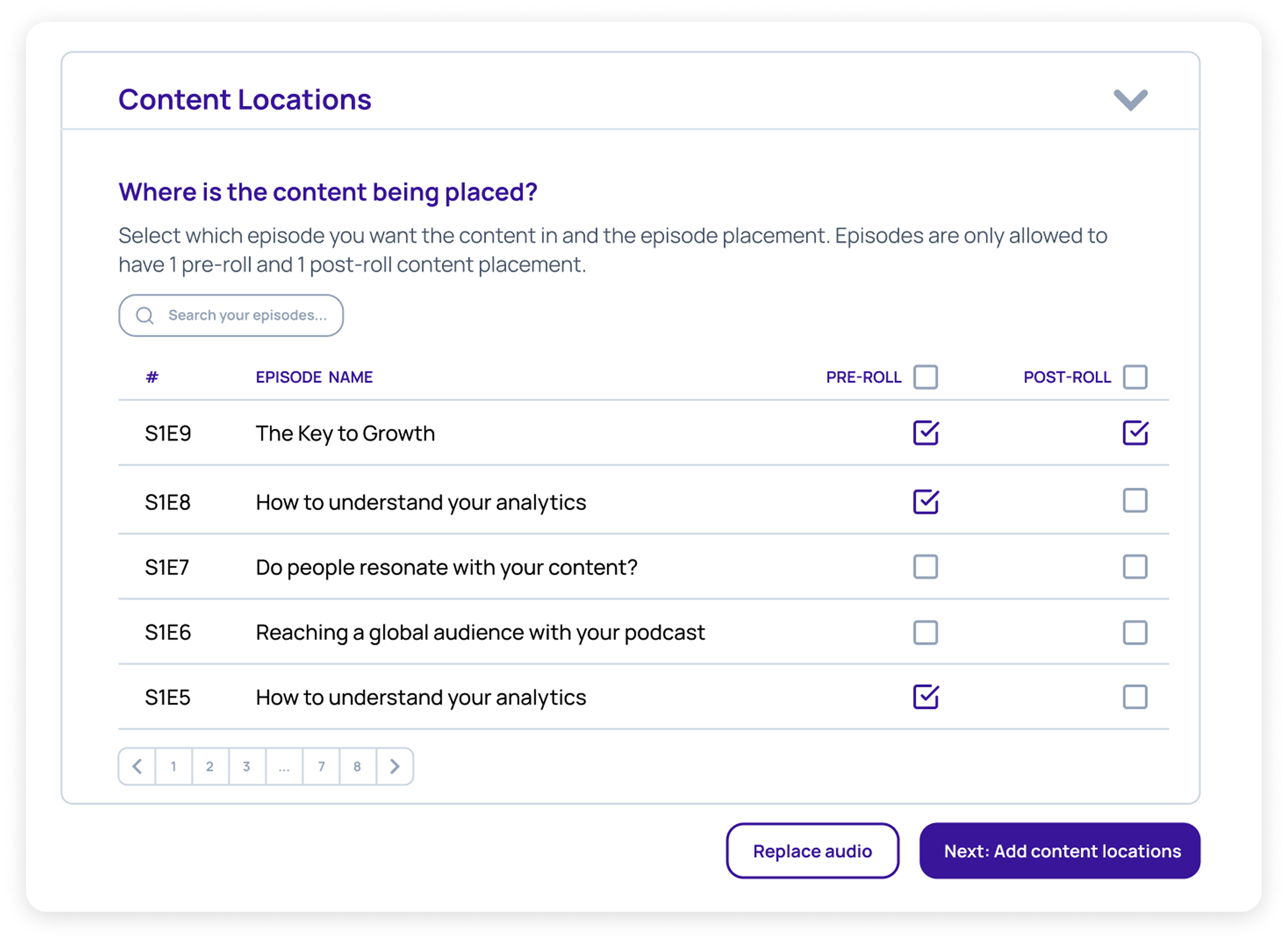 Choose the exact episodes to receive insertions, then start/stop anytime.