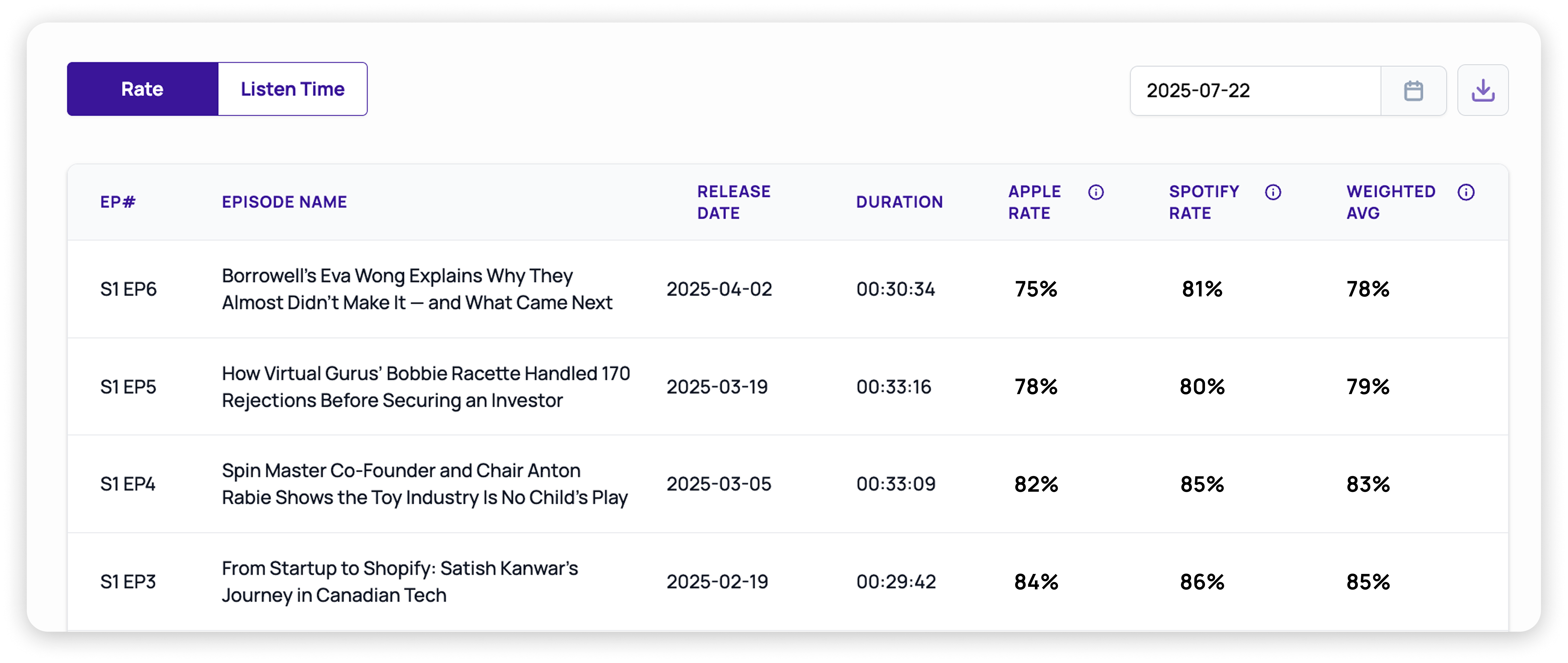 We present episode-level consumption rates and listen times from both Apple and Spotify. We also offer a show-level consumption rate just from Apple.