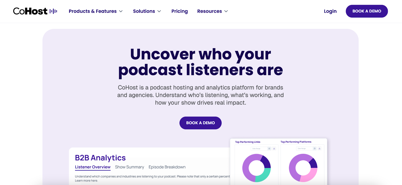 For brands and agencies focused on ROI, CoHost stands out by offering deeper insights, including firmographics, demographics, psychographics, new listeners, consumption behavior, and show and episode-level analytics. This level of data helps teams understand who their audience actually is, how they’re discovering the show, and which episodes drive meaningful engagement.