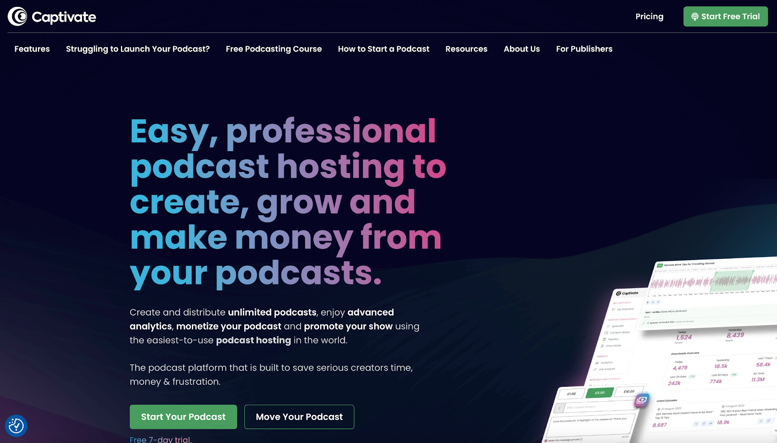 What sets Captivate apart for many podcasters is how it combines core hosting with growth‑oriented features at every level. Monetization options like memberships, listener tips, and other revenue streams are built right into the platform, and analytics are available to every user without being hidden behind premium tiers.