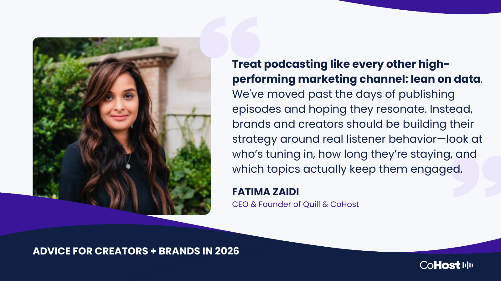 “My biggest advice for brands and creators in 2026 is to treat podcasting like every other high-performing marketing channel: lean on data. We've moved past the days of publishing episodes and hoping they resonate. Instead, brands and creators should be building their strategy around real listener behavior—look at who’s tuning in, how long they’re staying, and which topics actually keep them engaged.