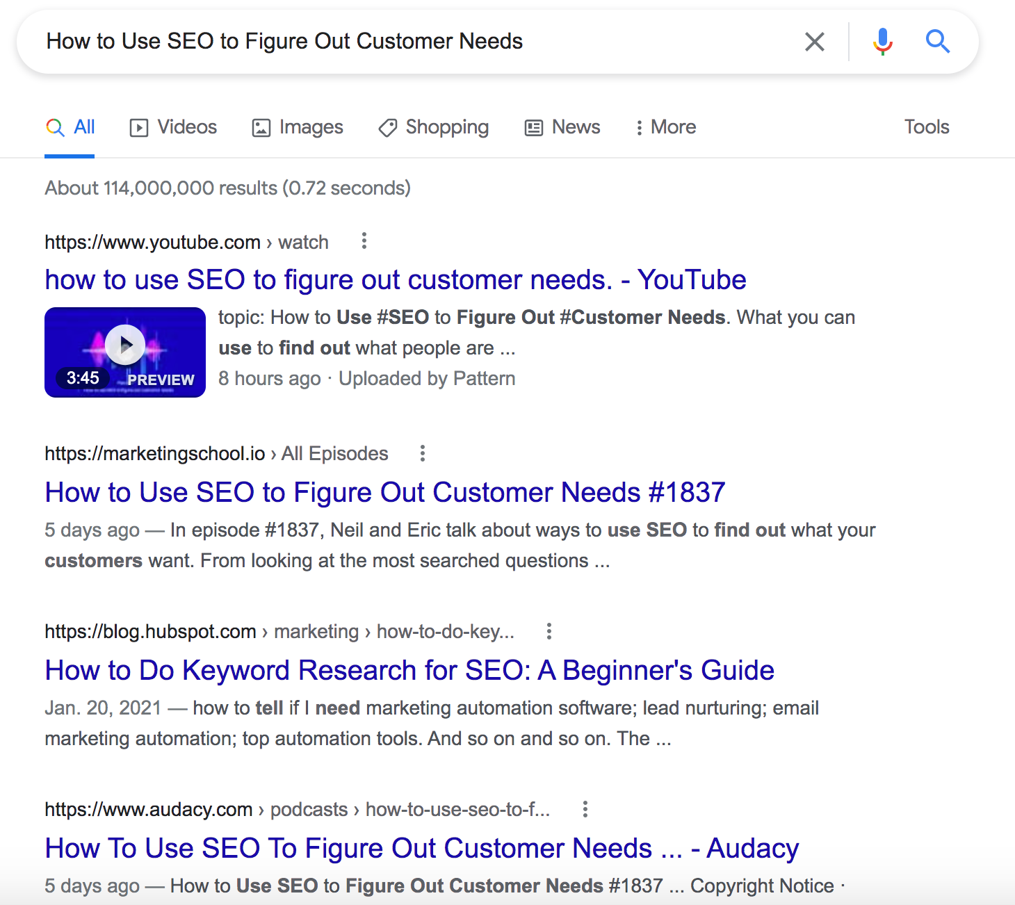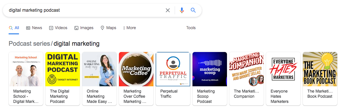 And finally, try to add a relevant and valuable keyword to your title. For example, I did a quick search on Google for “digital marketing podcast” and here are my results: