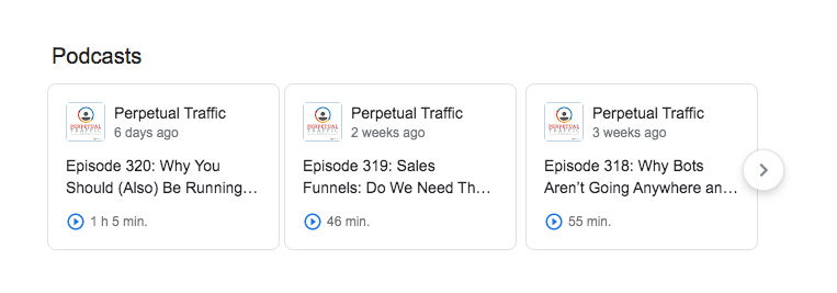 For example, within the same search of “digital marketing podcast,” if I scrolled down the page further to different results, I also had an embed of the Perpetual Traffic podcast: