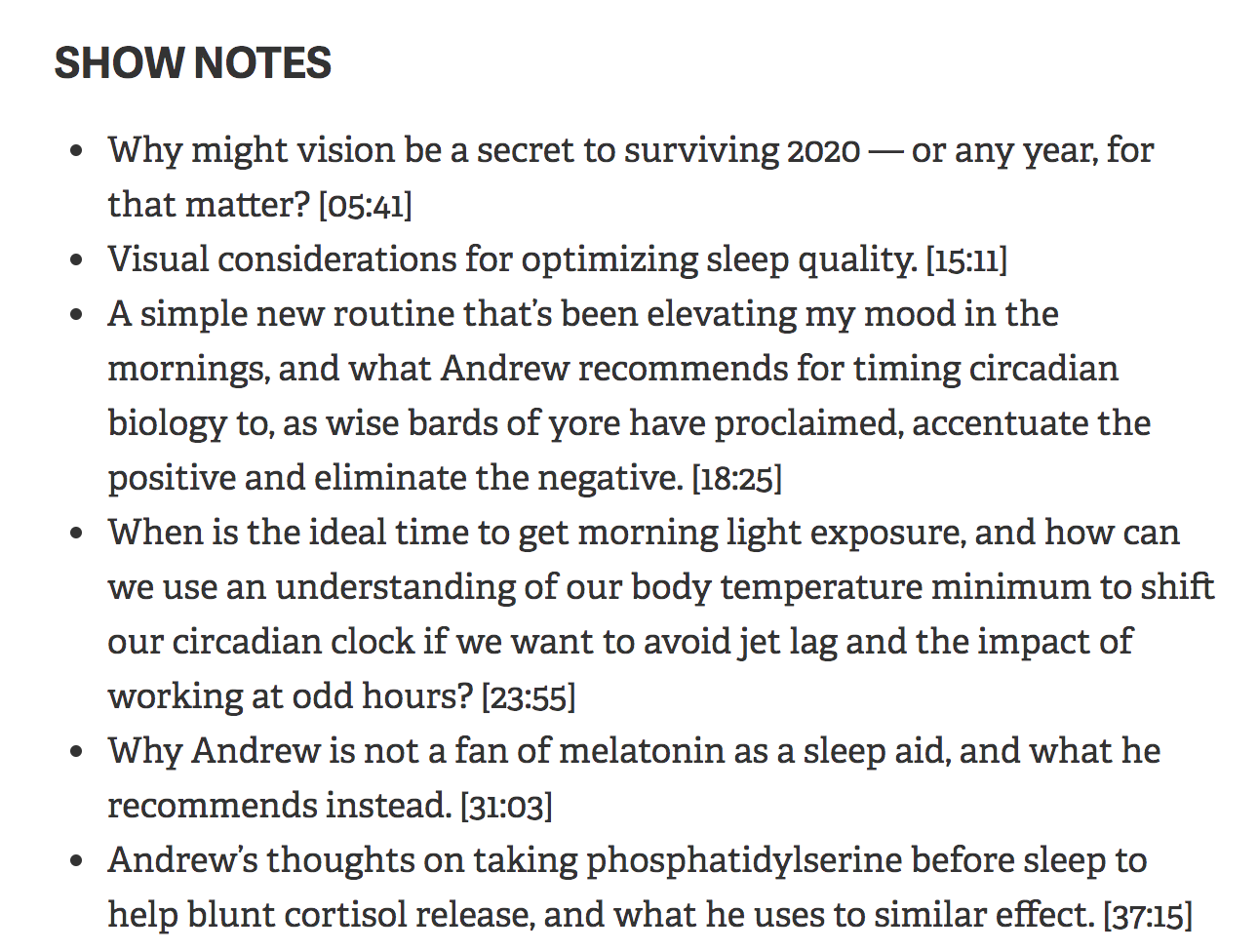 They start off with the header “Selected Links from the Episode” and then share Dr. Andrew Huberman’s contact information, followed by a long list of links either referenced in the episode or ones that Ferriss has decided would be useful to the listener.