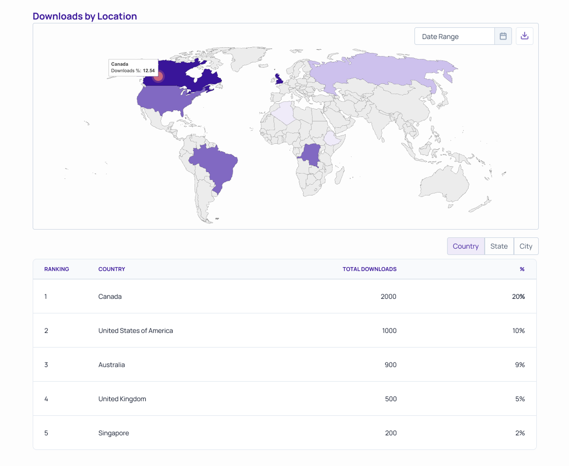 - The Audience Profile: The ‘Downloads by Location’ map and table provide precise geographical insights, allowing you to track where your unique listeners live.