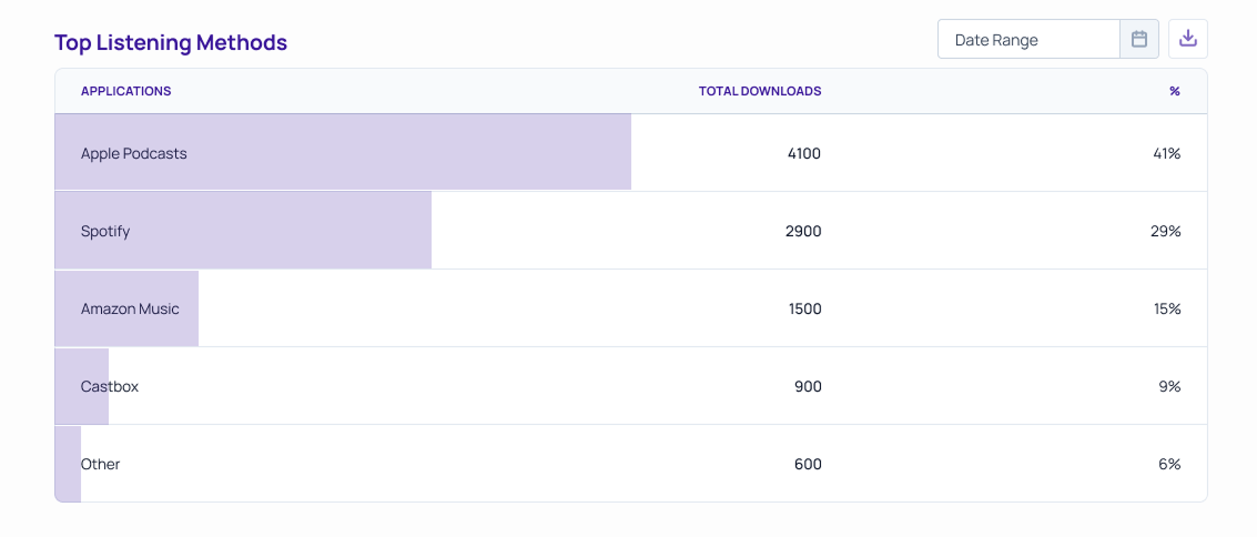 - Downloads by Time of Day: Shows exactly when your audience is most active, allowing you to optimize your release schedule to reach your target audience and strategically publish episodes when your target audience is most likely to engage.